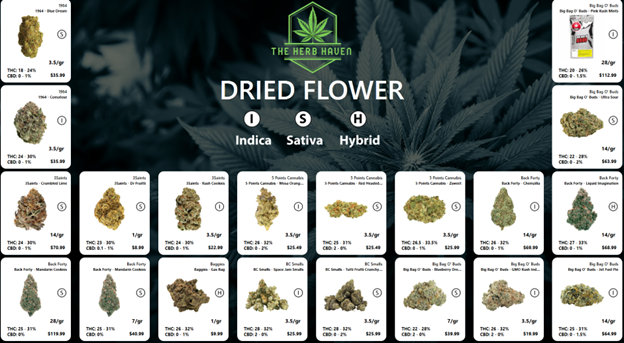 • Highlight products by strain, effect, or staff picks with full THC and CBD details.